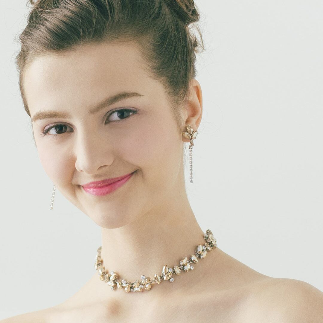 繊細なニュアンスを放つスワロフスキークリスタルゴールデンシャドウを使用したネックレス&イヤリング。